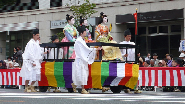 京都時代祭に登場する大田垣蓮月は、後に尼となり、連月と名前を変えています。江戸時代婦人列のなかでは、若きの日の姿で登場します。そして、中村内蔵助の妻(なかむらくらのすけのつま)は、当時の衣装比べの逸話を持つ人物として有名です。富豪の妻ですから、衣装にかけるお金も相当だったようです。