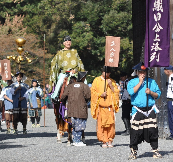 その後は、織田公上洛列(おだこうじょうらくれつ)です。この列では、1568年、永禄11年9月に、天下統一をするため織田信長が兵を連れ上洛した時のようすを再現しています。ご存知、織田信長は、1573年に室町幕府を滅ぼした後、天下統一を目前にして、本能寺の変で明智光秀に破れました。