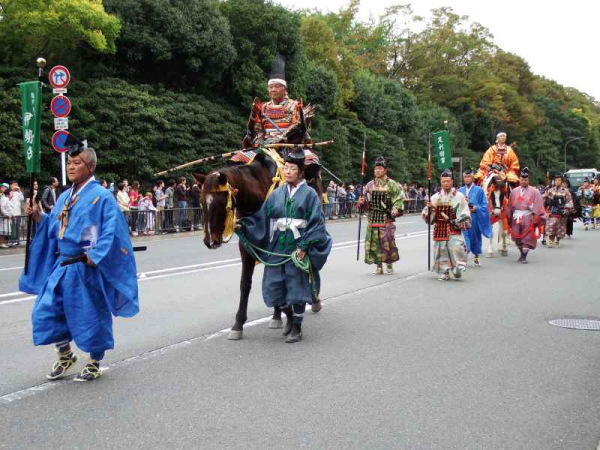 足利尊氏の行列は、以前はなかったもので、室町時代の行列は存在せず、近年、追加されています。「室町時代の追加を!」という声も多かったようですが、祭神の桓武天皇と孝明天皇を祀るものなので、逆賊と言われている足利尊氏の登場は時代祭のスタート時から、ずっと見送られていたそうです。近年、ようやく室町時代が加わったことで、やっと時代がつながったといえるでしょう。