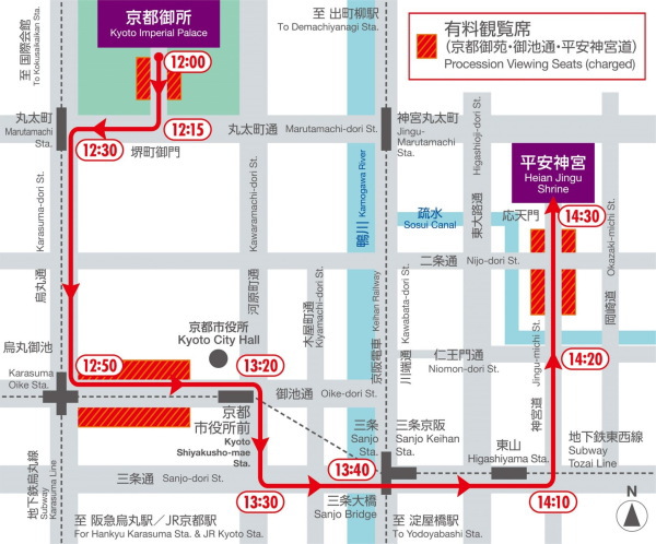 こうした苦労をしたくない方は、有料席がおすすめです。有料席は何箇所かありますが、御池通りの有料席は遠くまで見えますので、長い行列が一望できるメリットがあります。有料観覧席は予約販売されており、全席が指定となっていますので、時代祭に行くことが決まっている方は早めに予約しておきましょう。一番、人気がある観覧スポットの有料席は出発地点の御所付近です。こちらは、なんと販売スタートした即日に完売になるそうですから気をつけてください。