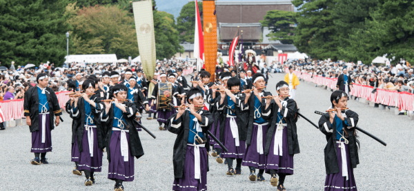 時代行列では、明治維新から、延暦時代まで、みなさんがご存知の歴史上有名人に扮した方々を見ることができます。例えば、明治維新時代の見所は維新勤王隊列です。京都時代祭の長い行列の先頭は、維新勤王隊列で、鼓笛を鳴らしながら進みます。時代行列の姿が見える前にも、遠くから、この鼓笛の音が聞こえてくるのも乙なものです。時代祭を感じさせる京都ならではの音でしょうね。